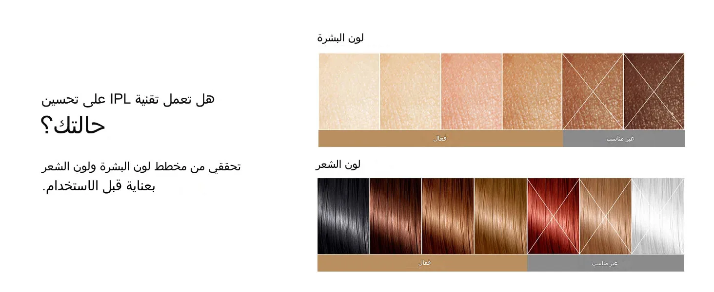 ● IPL epilator is suitable for white to light brown skin and black to light brown body hair. However, this product should not be used on: suede, tattoo, spotted dark skin, white, gray or red body hair (see skin color chart)