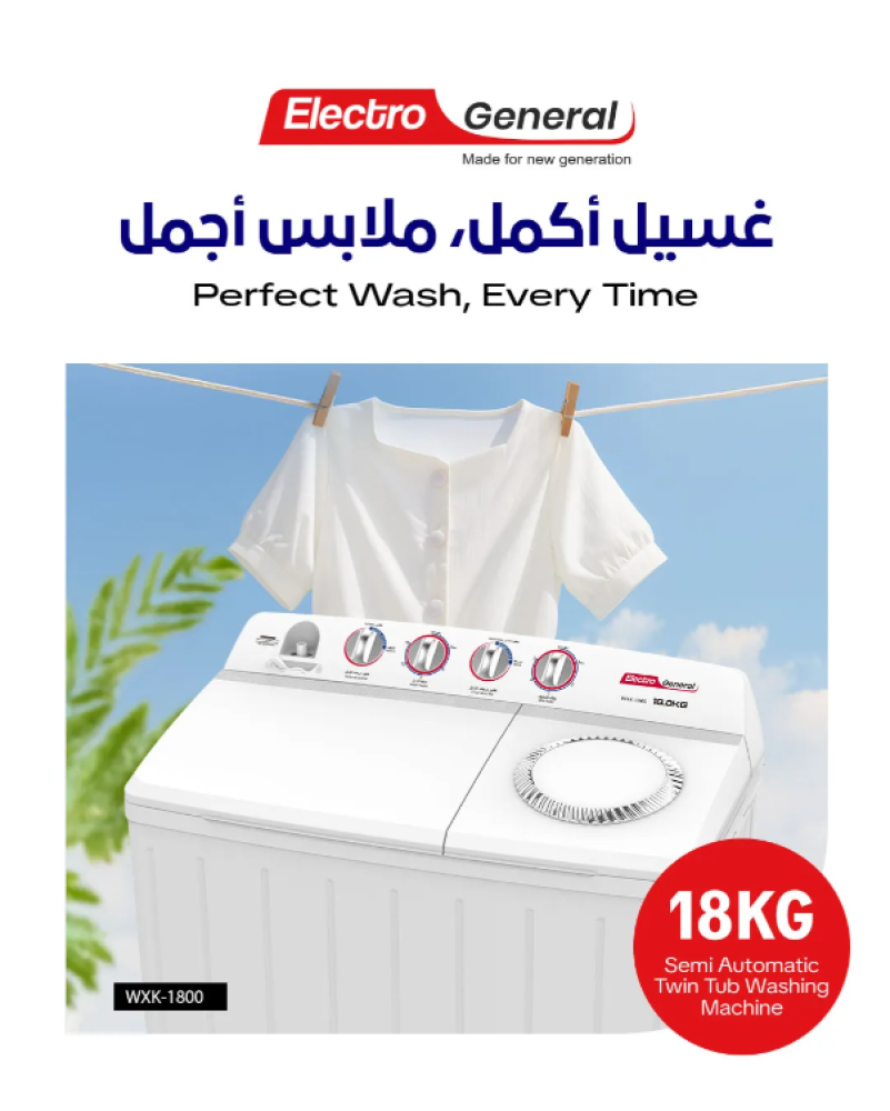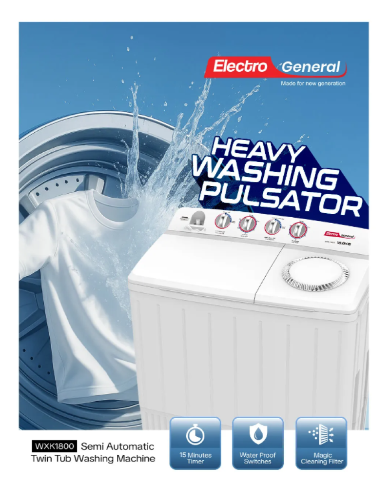 Electro General 18KG Twin Tub Semi-Automatic Washing Machine WXK-1800, White, 13KG Spin Capacity, Heavy Wash Pulsator, Effective Drying, Magic Cleaning Filter, White Lids & Knob with Silver Painting, Compact Design