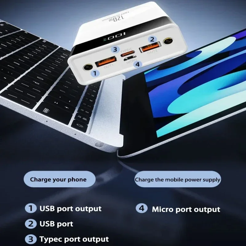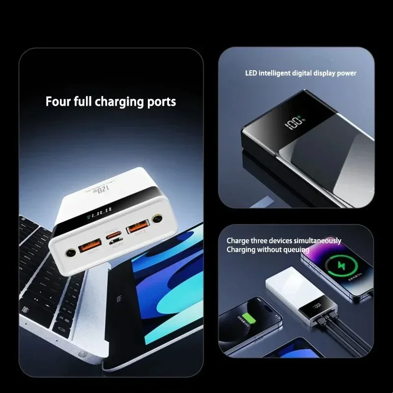 At a staggering 100000 mAh capacity, this power bank ensures that you never run out of juice, no matter how power-hungry your devices are. Whether you're on a long journey, camping trip, or simply navigating a busy day, this power bank provides ample power to keep your devices charged multiple times over without the need for frequent recharges.